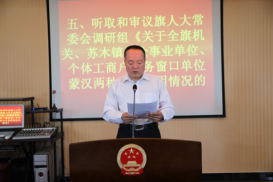 会议听取和审议了旗人大常委会调研组《关于全旗文化旅游融合发展情况的报告》《关于全旗商贸物流市场建设情况的报告》《关于中华人民共和国民事诉讼法实施情况的报告》《关于全旗机关、苏木镇、企事业单位、个体工商户服务窗口单位蒙汉两种文字使用情况的报告》《关于社会救助等民生保障工作开展情况的报告》;听取和审议了旗政府《关于2017年旗本级财政预算执行和其他财政收支审计情况的报告》《关于城市管理执法工作开展情况的报告》,审议通过了《扎鲁特旗人民代表大会常务委员会工作规则(试行)》。