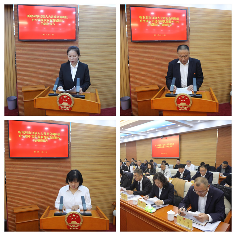 会议听取和审议了旗人大常委会调研组对全旗现代农业发展情况的调研报告;听取和审议了旗人大常委会调研组对全旗人才建设和就业服务工作开展情况的调研报告;听取和审议了旗人大常委会调研组对全旗中等职业教育发展情况的调研报告;听取和审议了旗人大常委会调研组对全旗侨务工作开展情况的调研报告。