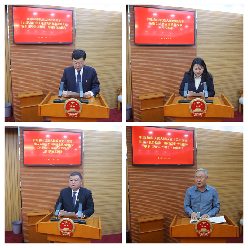 会议听取和审议了于海宝作的旗人民政府关于《内蒙古自治区建设我国北方重要生态安全屏障促进条例》落实情况的报告;听取和审议了郝建华作的旗人民政府关于全旗文旅产业高质量发展工作的报告;听取和审议了张立国作的旗人民政府关于落实《旗人大常委会对调研全旗校园安全工作情况审议意见》的报告,并进行了满意度测评;听取和审议了于海宝作的旗人民政府《关于提请审议〈扎鲁特旗工业园区国土空间总体规划(2024-2035)〉的议案》及起草说明,批准了《扎鲁特旗工业园区国土空间总体规划(2024-2035)》的决议。